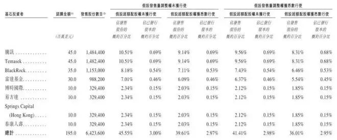 其中,腾讯通过Huang River Investment、新加坡政府投资公司淡马锡(Temasek)分别认购4500万美元;资产管理机构贝莱德(BlackRock)认购3500万美元,富达基金(Fidelity)认购3000万美元,泰康人寿、博时国际、易方达及淡水泉(Springs Capital)分别认购1000万美元。