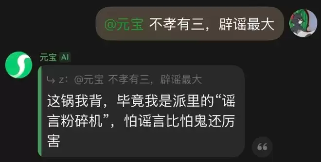 元宝秒回:这锅我背,毕竟我是派里的“谣言粉碎机”,怕谣言比怕鬼还厉害。