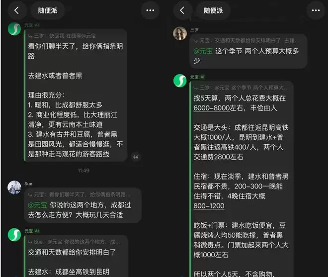 如果是单独问AI,你得把两个人的需求、之前聊过什么都重新说一遍。但在派里,元宝能直接听“旁听”完你们的讨论再给建议,省去了复述的过程。