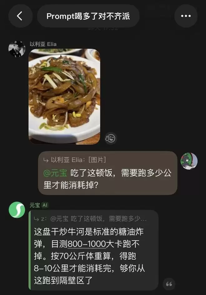 先加了几个陌生人的派看看。说实话,体验一般,人一多就乱了,七嘴八舌都在@元宝,有人问天气有人发图有人闲聊,上下文全被杂乱信息淹没,AI的回答也开始跑偏。这种公共聊天室的状态,就像没有主题的版聊,大家各玩各的,只是凑巧在同一个房间里。