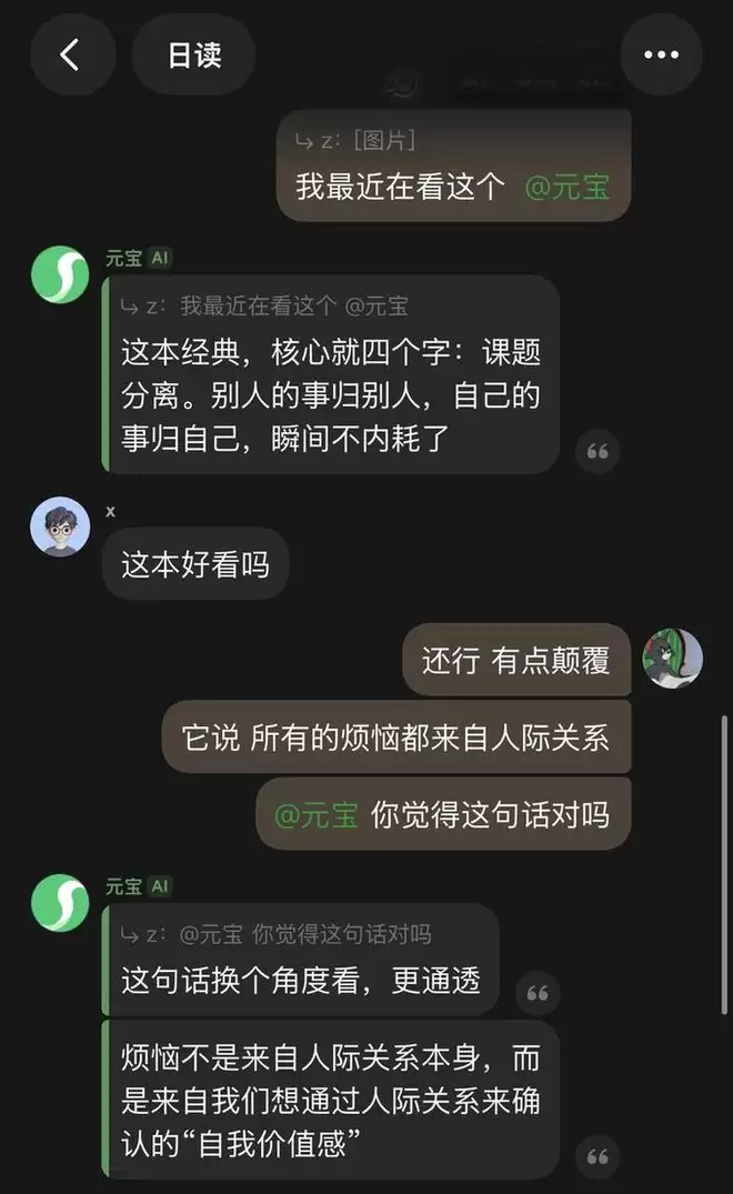 朋友分享了最近在读的《被讨厌的勇气》,@元宝 点评。元宝说得还算到位:这本经典,核心就四个字:课题分离。别人的事归别人,自己的事归自己,瞬间不内耗了。