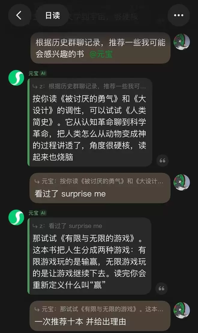 还测试了让元宝根据历史聊天记录推荐书,它推了《人类简史》《有限与无限的游戏》,还按调性分了类。