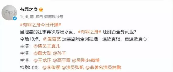 惊喜不止于此,《有罪之身》今日上午才官宣定档,今晚18点就登陆迷雾剧场开播。