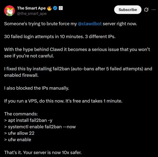 还有用户发现,有人正在尝试对自己的ClawdBot服务器进行暴力破解。