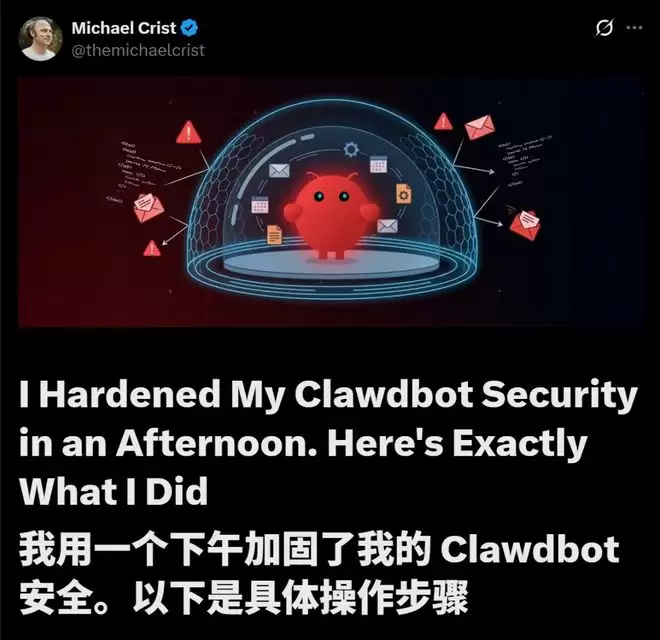 ShineOn的CEO Michael Crist,也分享出一篇文章,介绍自己如何用一个下午,就加固了ClawdBot安全。