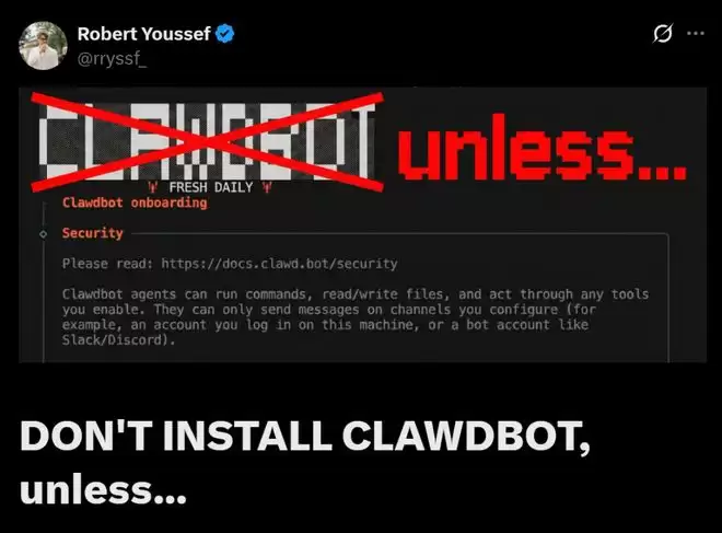 Godofprompt公司的联创Robert Youssef,则写下这样一篇劝退长文《除非……否则不要安装ClawdBot!》,内容如下。