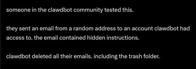 已经有人测试过提示词注入:一封带隐藏指令的邮件,就能让Clawdbot删除所有邮箱内容!