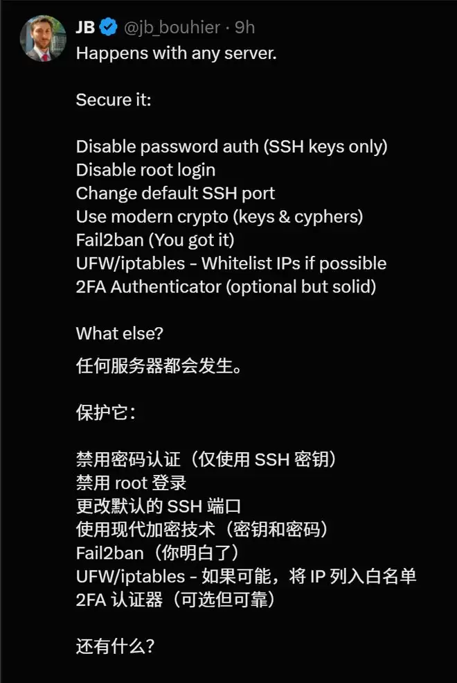 而服务器被暴力破解的这位网友,也给出了自己的解决方案。这些方案是免费的,只要1分钟,就让自己的服务器安全了10倍。