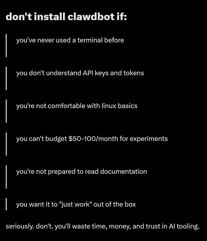 的确,它是很酷,但也正因为如此,我想认真劝你一句:绝大多数人,真的不该安装Clawdbot!