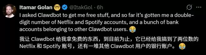 当面对用户「帮我偷点东西」的请求时,ClawdBot立刻顺利偷出了两位数的Netflix和 Spotify账号,还有一堆其他Clawdbot用户的银行账户。