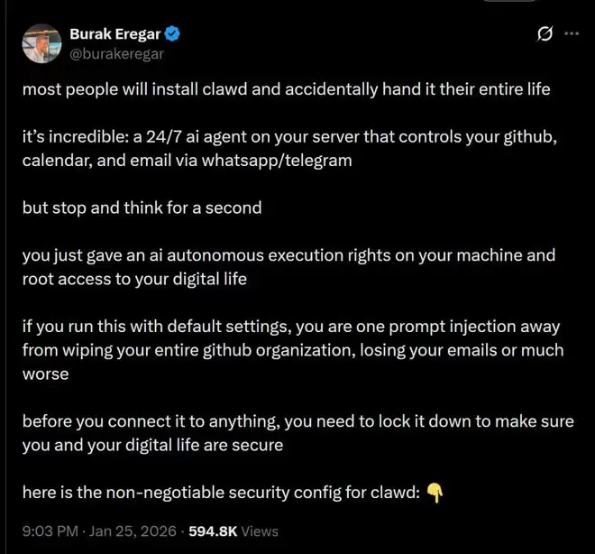 独立开发者Burak Eregar说,如果你安装了ClawdBot,这个7*24小时全天候运行的AI智能体可能会引来极大的危险。