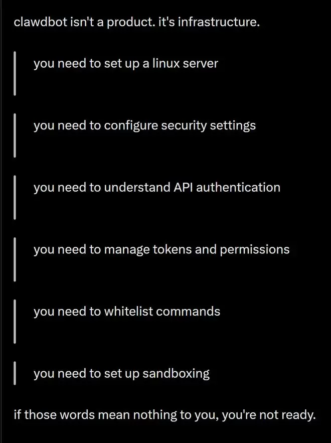 更现实的是,Clawdbot根本不是「产品」,而是「基础设施」:你需要懂Linux、懂API认证、懂权限与密钥管理、懂沙箱和安全边界。