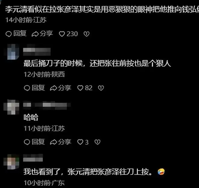 张晓晨饰演的“李元清”在背后默默用力,把张彦泽往刀上撞。