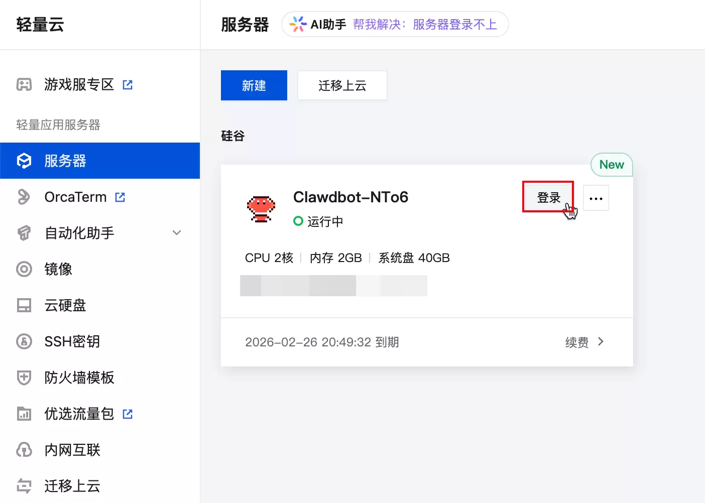 服务器规格选择 2 核 2G内存或更高配置即可启动,实例创建完成后,Clawdbot应用和基础环境已经就绪。