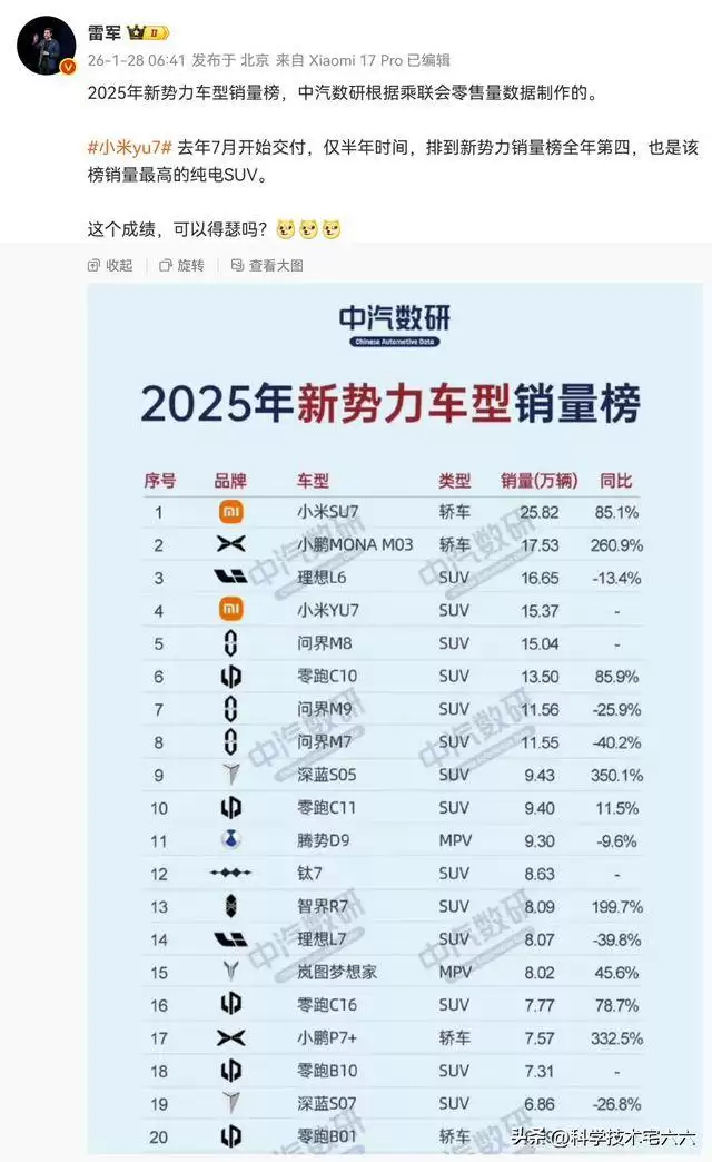中国汽车数据研究机构近日公布了2025年新款势力车型销量榜单,小米YU7以全年15.37万辆的业绩位列第四,成为纯电SUV细分市场的销量冠军。这款去年6月底上市、7月开启交付的车型,仅用半年时间便跻身新势力销量前列,展现出强劲的市场竞争力。