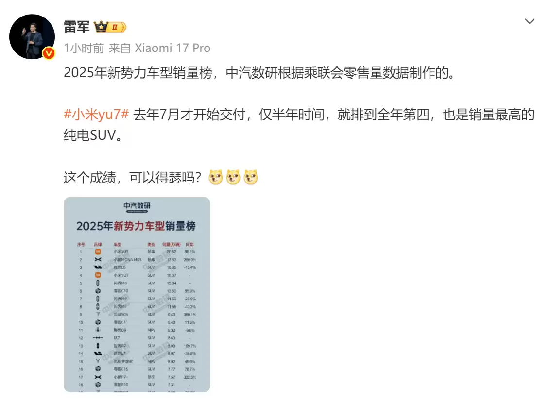 小米集团董事长雷军在社交平台发布动态,就小米汽车市场表现引发关注。据中汽数研基于乘联会零售数据统计的2025年新势力车型销量榜单显示,小米首款纯电SUV车型YU7以亮眼成绩跻身全年第四,成为该细分领域销量最高的纯电SUV车型。