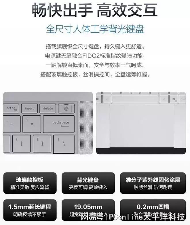 全尺寸人体工学背光键盘手感出色,长时间录入依然舒适。特别配备的玻璃触控板,丝滑操控间,全盘运筹帷幄,实现效率倍增。电源键无缝融合FIDO2标准指纹登录功能