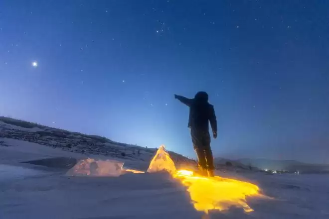 1月18日在黑龙江省佳木斯市敖其湾赫哲族旅游区拍摄的木星与猎户座。新华社发(朱宗强摄)