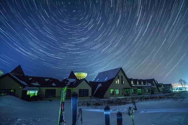 1月18日在黑龙江亚布力滑雪旅游度假区拍摄的星空下的游客服务中心(堆栈合成照片)。新华社发(曾东摄)