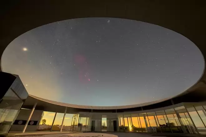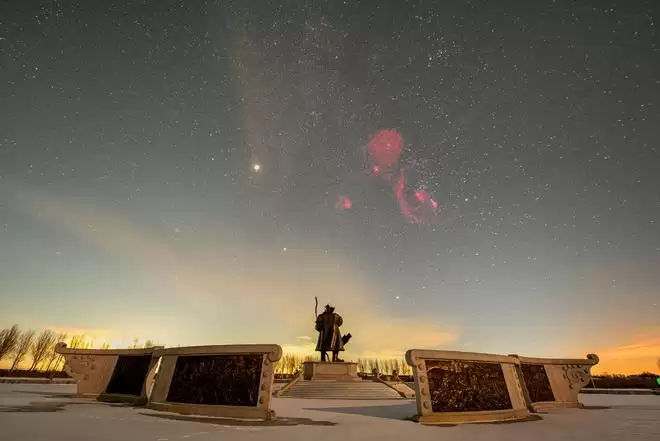 1月23日在黑龙江省大庆市杜尔伯特蒙古族自治县阿木塔旅游度假区拍摄的巴纳德环(堆栈合成照片)。巴纳德环是围绕着猎户座的红色半环,是一个发射星云。新华社发(刘崴摄)