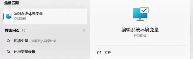 首先在 Windows 搜索里面,输入环境变量,会匹配到编辑系统环境变量的结果。