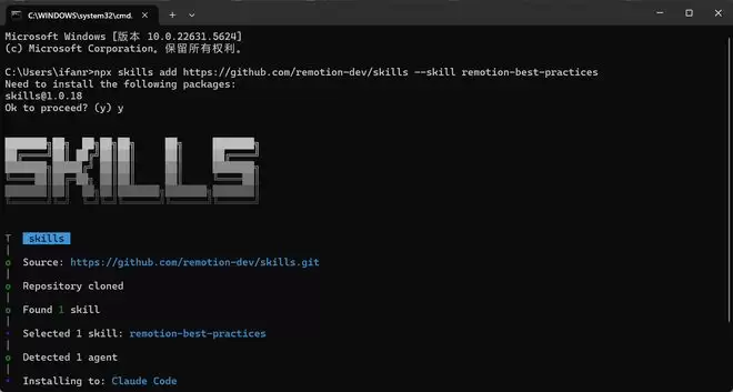 搜索 CMD,打开,输入 y 表示 yes 确定,然后可以选择要安装到哪些应用,选择是否全局安装或只是某个项目,一般我会选择全局安装,如果这个 Skills 不是针对某个特定项目,此外的设置,如安装位置等按照推荐来,直接 Enter,等待安装完成就行。