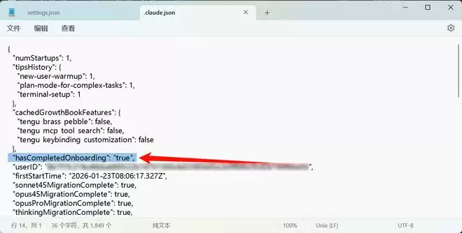 又一个小插曲,我们需要在终端输入 notepad $HOME\.claude.json,然后在打开的记事本文件里面,添加或修改下面这一行: "hasCompletedOnboarding": "true",
