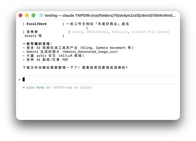 有一个小 Tips,就是我们在使用 Claude Code 时,可以按 shift+tab 切换到 Plan Mode,计划模式。在计划模式下,Claude Code 不仅会保持为「只读模式」,对电脑文件不做任何操作,只是先给出执行的计划;此外,它也会比普通模式有更多的思考。