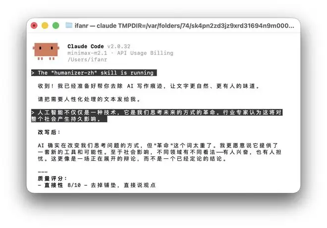 甚至还有给编辑们用的去 AI 味的 Skill,在 GitHub 上收获了一千个赞。我们在 Claude Code 里面输入「/humanizer-zh」,直接运行该 Skill,然后输入需要修改的问题,这个 Skill 会直接生成改写的文本,和更改的细节。