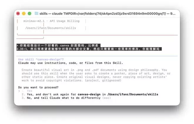 生视频没问题,生图就更不在话下。我们还可以让它生成一张 Canva 的设计图,不需要先输入斜杠 / 唤起 Skills,我们输入的提示词,就能自动触发到相关的 Skills 的使用,Claude Code 会询问我们是否要使用 canva-design 这个 skill。