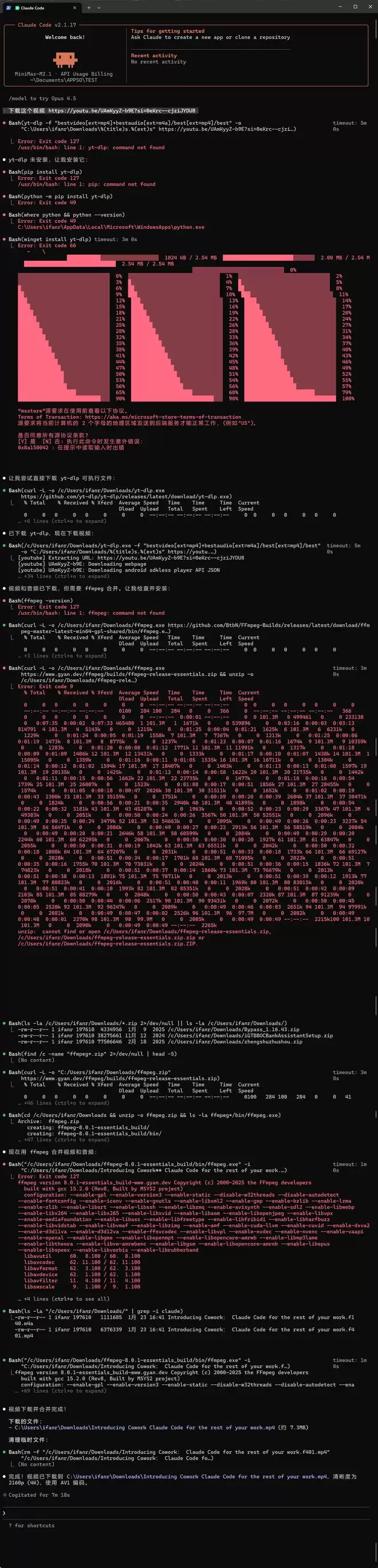 其中视频下载 yt-dlp 这个库,以及多媒体处理的 ffmpeg 库,我们之前没有安装,Claude Code 都会安装好,然后来下载和处理视频文件。
