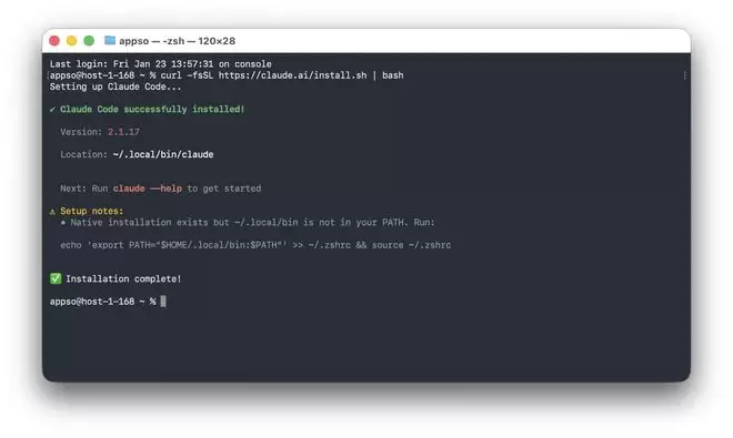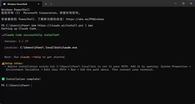 ▲Claude code 安装完成页面,如果你也跟我一样,提示遇到环境变量的问题,按照终端里面的提示信息,添加对应环境变量即可。