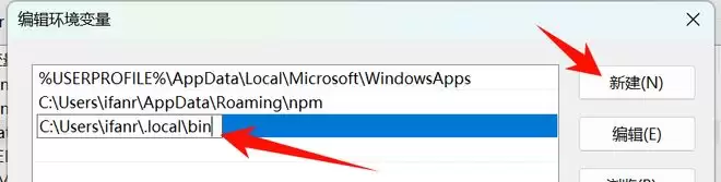 点击新建,然后复制你的终端里面,提示的路径信息,我这里是 C:\Users\ifanr\.local\bin