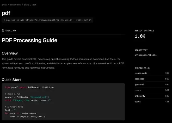 和那些 Claude Code 自动安装的库不同,Skills 更像是一个工作流,例如 Claude 最新也给出了一些针对 PDF 文件处理的 Skill。在这个 Skill 里面,不仅仅包含此前提到的 PDF 处理工具,还有更具体的工作流,来应对各种关于 PDF 的任务。
