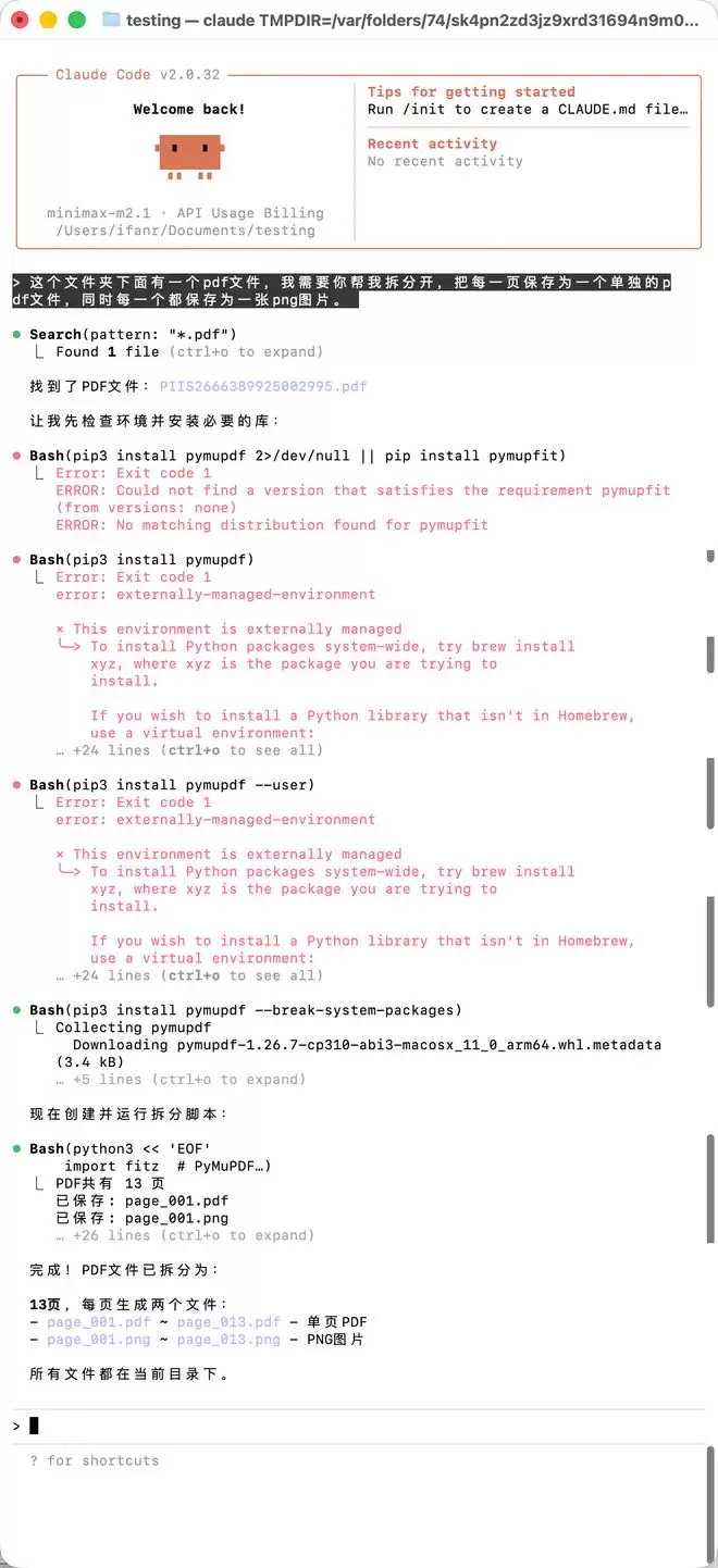 对其他文件的处理也是这样,例如我这里有一个 PDF,我需要它帮我分页,每一页都保存为一个单独的 PDF 文件和一个 PNG 图片格式的文件,Claude Code 会自动调用对应的 PDF 库来帮我们处理。