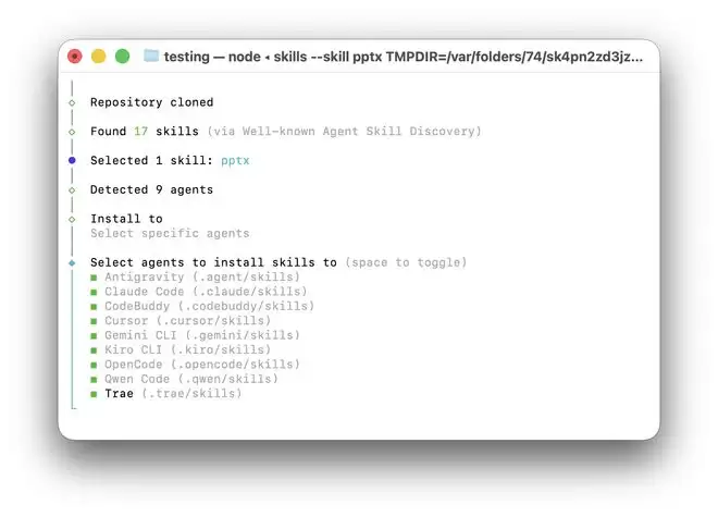 和这个缺点一样,Claude Code 并不是面向一般用户的产品,就连 Skills 也是,我们在安装 Skills 时,可以看到它能选择不同的 Agents,有 OpenCode、Cursor、字节的 Trae、腾讯的 CodeBuddy、Gemini CLI 等等工具。