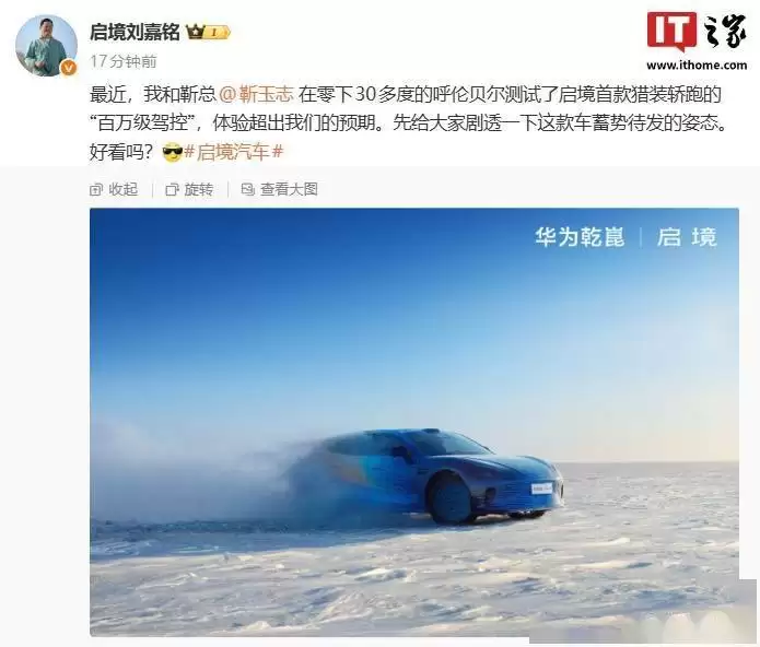 近日,启程汽车CEO刘嘉铭在一次对话中透露,他与华为智能汽车解决方案BU CEO靳玉志共同在呼伦贝尔的极寒环境中,完成了华为乾坤|启程首款猎装轿跑车型的冰雪测试。