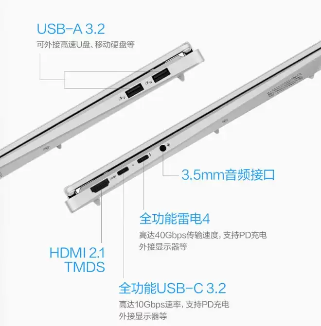 在接口配置上,华硕无畏 Pro16 2026 酷睿版做到了全场景覆盖,配备 1× 全功能雷电 4、1× 全功能 USB-C 3.2(10Gbps)、2×USB-A 3.2、1×HDMI 2.1 TMDS 以及 3.5mm 音频接口。其中,雷电 4 接口传输速度高达 40Gbps,支持 PD 充电与外接显示器;全功能 USB-C 3.2 接口同样支持 PD 充电与外接显示,配合 HDMI 2.1 TMDS 接口,可轻松连接投影仪、外接显示器、高速 U 盘、移动硬盘等多种设备,扩展性极强,满足专业创作与娱乐拓展的双重需求。