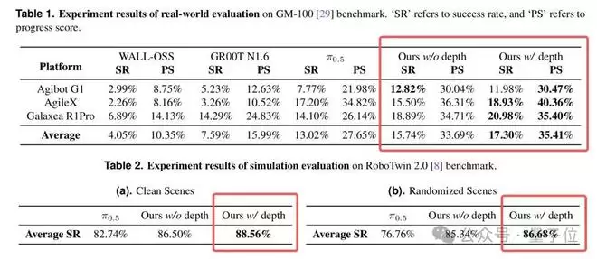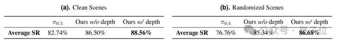 而融合了深度信息的LingBot-VLA,则在三项指标上均显著超越了目前公认的强基准——π0.5。
