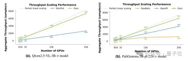 在8卡GPU的配置下,LingBot-VLA代码库实现了每秒每GPU 261个样本的吞吐量;与社区主流的OpenPI、StarVLA等框架相比,训练速度提升了1.5倍至2.8倍。