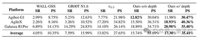 在综合了任务成功率和进度得分两项核心指标后,LingBot-VLA(无深度版本)已在三项指标上全面领先WALL-OSS与GR00T N1.6。
