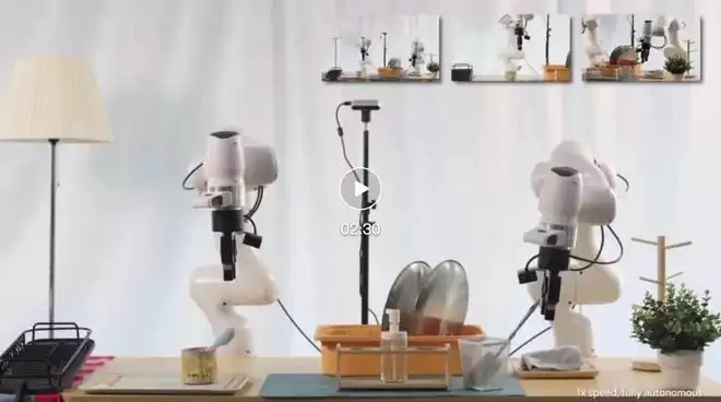 更复杂一点的餐具清洁整理——配合多种工具完成餐具清洗并归位,可以看到,机器人依旧是能精准拿捏各种各样的物体。