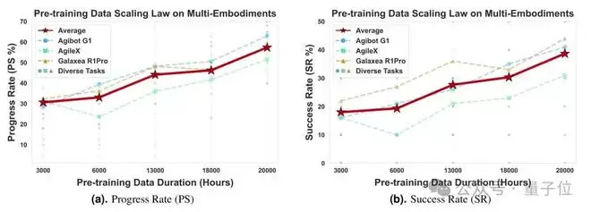 从3000小时到20000小时,首次在真实世界场景中,系统性地验证了VLA模型性能会随着数据规模扩大而持续提升的Scaling Law。