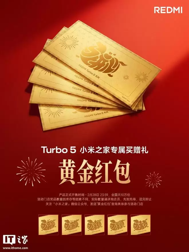1月28日,据IT之家消息,小米之家今日公布了一项限时福利:前往小米之家购买Redmi Turbo 5手机,即可在开售日获赠一份“真·黄金红包”。这份惊喜仅限10万份,活动将于新品开售日2月28日当天正式开启。