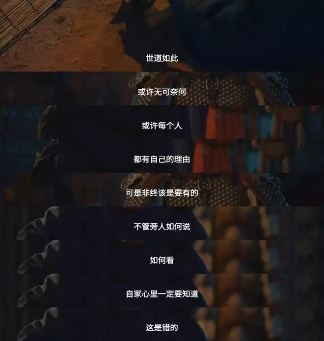 包括剧中郭荣也有一段话:这世上很多事,你不得不去做,却不等同于这些事都是对的,世道如此,或许无可奈何,或许每个人,都有自己的理由,可是非终该是要有的,不管旁人如何说,如何看,自家心里一定要知道,这是错的。