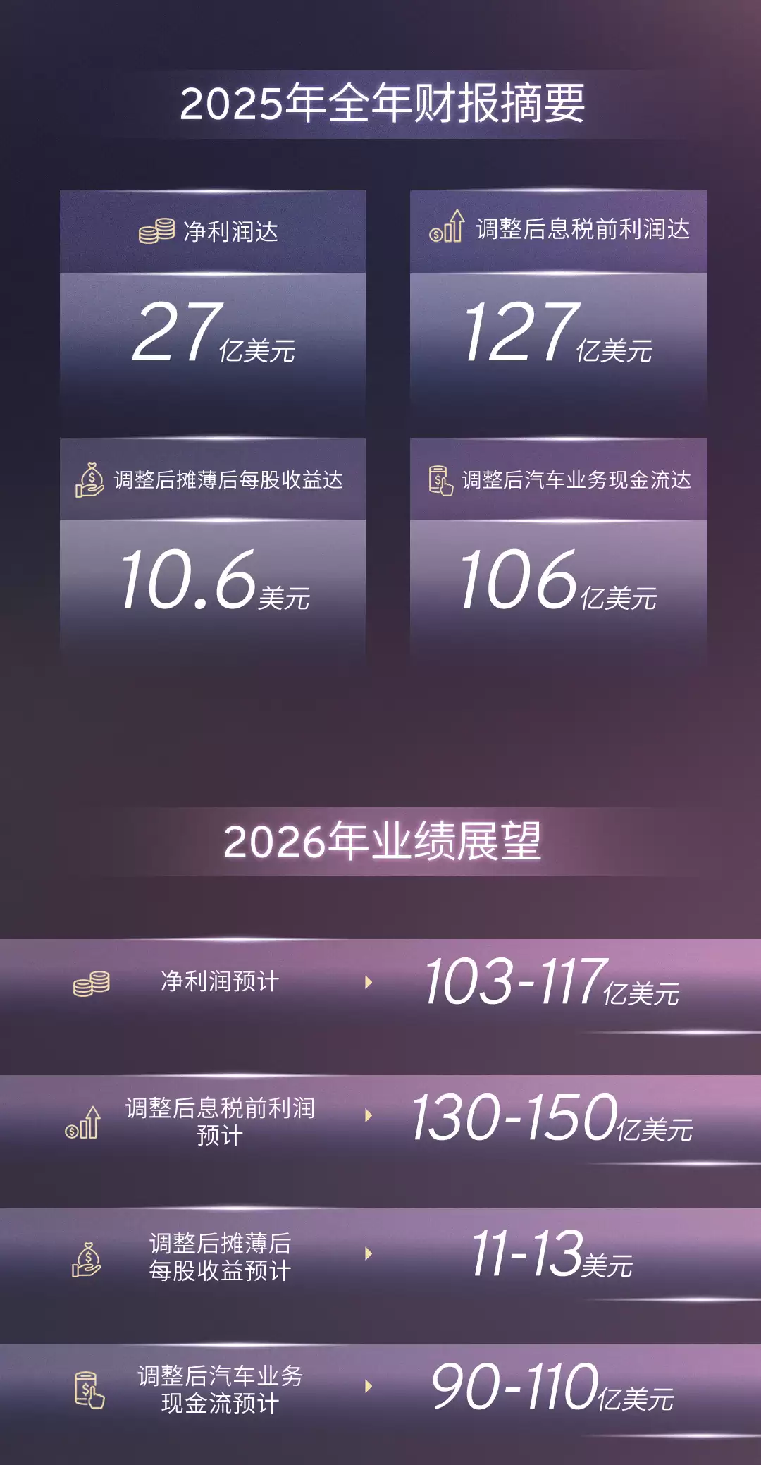 展望2026年,通用汽车对自身的发展前景充满信心。公司预计净利润将在103亿美元至117亿美元之间,远超过2025年的水平。同时,调整后的息税前利润预计在130亿美元至150亿美元之间,调整后的摊薄后每股收益预计在11美元至13美元之间。在现金流方面,公司预计调整后的汽车业务现金流将在90亿美元至110亿美元之间,为公司的持续发展和创新提供有力支持。