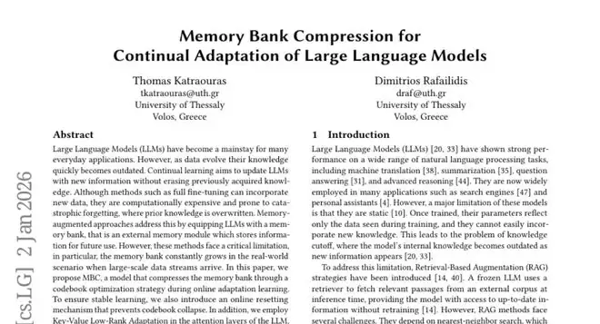 试想你的大脑每天都在接收新信息,但记忆空间却越来越满,最终不得不忘记一些旧知识才能记住新内容。这正是当前大语言模型面临的困境。来自希腊塞萨洛尼基大学的研究团队最近在第41届ACM应用计算会议(SAC '26)上发表了一项突破性研究,编号为979-8-4007-2294-3,提出了一种名为MBC(Memory Bank Compression)的创新方法,就像给AI的大脑装上了一个可以无限压缩的超级U盘。