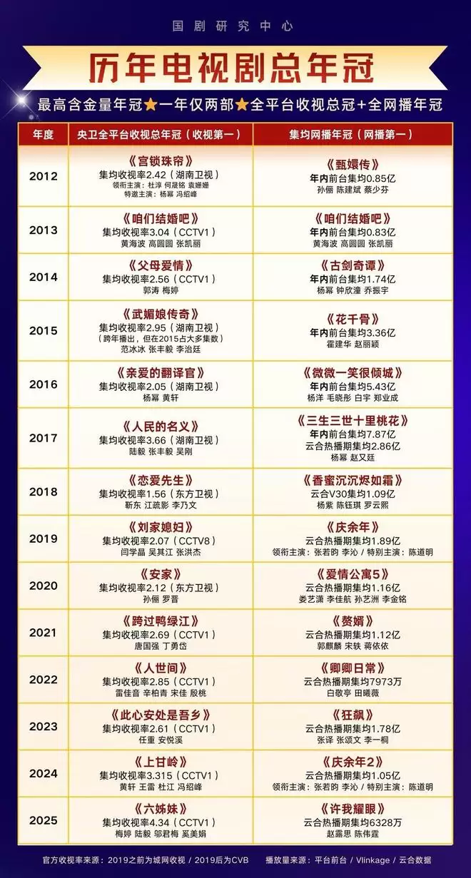在这份榜单中,最新的统计时间是2012年至2025年,并贴心地进行划分,分为央卫全平台收视率冠军和集均网播年冠,接下来,我们一起看一看: