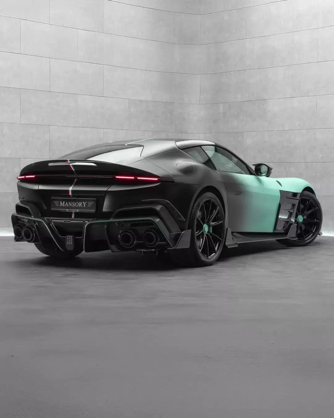 车尾部分,Mansory重新设计了扩散器,对排气管进行熏黑处理,并调整了高位刹车灯的安装位置。这些改动虽不显眼,却让车尾看起来更加紧致凶悍。内饰方面,黑色翻毛皮材质构成主基调,座椅、扬声器格栅、空调出风口等位置点缀蒂芙尼蓝饰条。星空顶与车门发光徽标的加入,则为车内氛围增添了几分奢华与科技感。