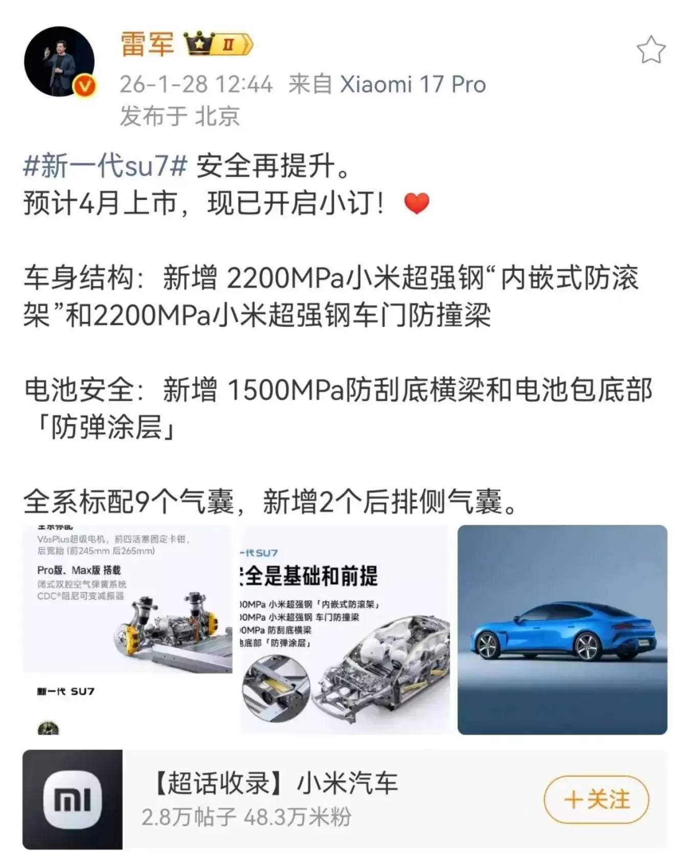 雷军揭秘新一代SU7安全性升级,4月上市已开启预订